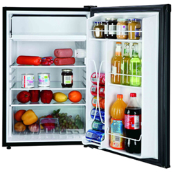 This compact bar fridge is the perfect size for your dorm room, bedroom, cottage or man cave. It's got the room you need to store easily accessible beverages and snacks with two full shelves, one half-shelf and a small freezer compartment.... Read more