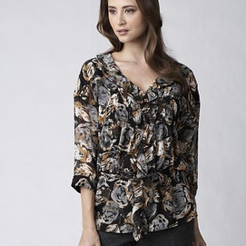 Ellen Tracy takes this blouson top to a whole new level of chic with a colourful print, unique accents and a pretty peplum hem. 100% polyester Machine wash V-neckline Three-quarter length sleeves Fabric covered buttons Ruffles down butto... Read more