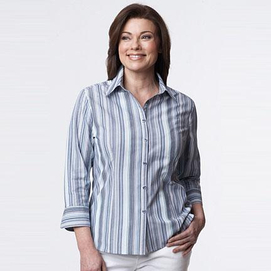 With its nautical blues, this shirt is perfect for spring. Crisp, fresh, and figure flattering, this shirt looks great on its own, or under a jacket or cardigan for cool, spring days. Machine wash in cool water, gentle cycle, with like colors, D... Read more