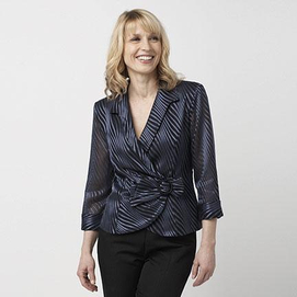 A versatile piece that can be paired with a skirt or pants! 66% polyester, 34% rayon cuffed sleeves Shawl collar Overlap side tie closure Body is lined with black woven lining Printed burnout fabric Dry clean