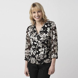 A versatile piece that can be paired with a skirt or pants! 66% polyester, 34% rayon Cuffed sleeves Flip collar Overlap side satin button closure Body is lined with black woven lining Printed satin jacquard burnout fabric Dry clean