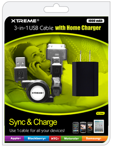 3-in-1 USB Cable with Home Charger,Sync and charge any device. All in one cable solution for all portable electronics.