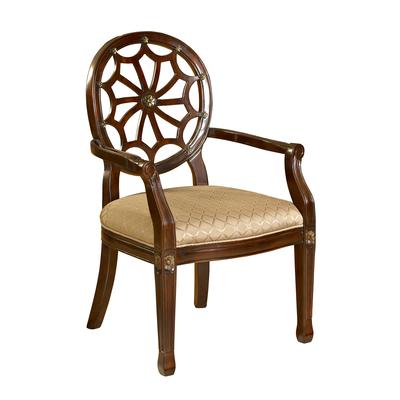 The Spider Web Back Accent Chair has a "medium mahogany" wood frame and an elegant diamond grain fabric seat. The unique details add interest and elegance. The perfect piece to add instant glamour to any space. Some assembly required. Accent chai... Read more