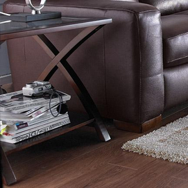 Adorn your living room in casual style with this attractive occasional group. The table top features bevelled glass inserts framed in birch veneer finished in a dark cherry. The ''X'' style legs add character while lower open bottom shelves ad... Read more