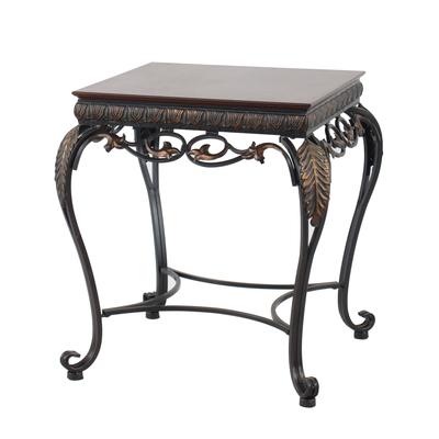 This elegant traditional style end table will go well in any living room. Note the decorative metal apron and curved metal legs. Sturdy metal frame construction in Navarre Gold finish and durable wood top in Antique Walnut finish give this ite... Read more