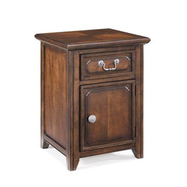 Traditional style Some assembly required Tables are constructed of hardwood solids with Cherry veneers Distressed toffee finish Table has one drawer 18"D x 18"W x 25"D