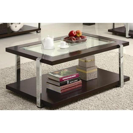 Transitional styling at its best that goes with most décor. Wood and wood veneers Full assembly required Bevelled Glass Inserts Stainless Steel Legs Open bottom shelf for storage or display purpose Rich coffee Finish 30.00'l x 47.00'w... Read more