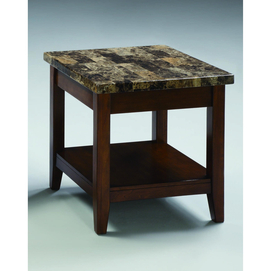 Wood and wood veeners with marble look laminate top Cherry finish Some assembly required wipe clean with a damp cloth 23 ½ x 23 ½ x 23 ½