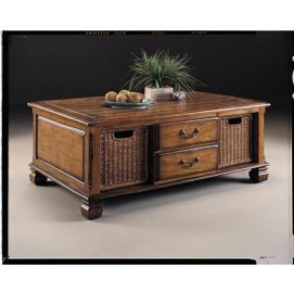 Cherry and mahogany veneers with Asian hardwood Cherry finish Solid and durable 2 wicker baskets in the table itself for storage 33"D x 53"W x 20"H