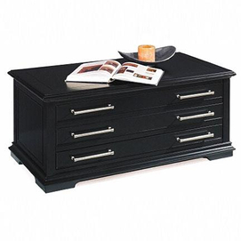 Traditionally styled table collection Dark contemporary finish Features a sliding top for extra storage Cedar lined with a bottom drawer and casters for easy mobility Some assembly required 25"L x 45"W x 19"H