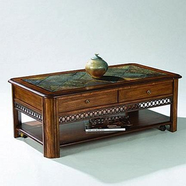 Contemporary Style Top is constructed with ash veneer and hardwood solids surrounding a slate insert. Bronze metal drawer pulls Base crafted with hardwood solids. Warm nutmeg finish Accessories not included 50"W x 28"L x 19"H