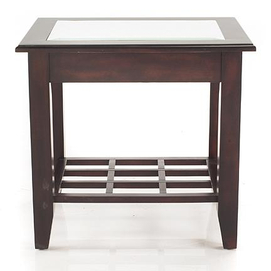 This contemporary end table will freshen up your living room Finished in a rich cappuccino finish Asian hardwood with veneer top with clear bevelled glass inset Attractive wood lattice shelf As offered in Sears Home stores and selected Sear... Read more