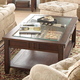 Constructed of wood and wood veneers Bevelled glass inset top 1 fixed shelf 28" D x 48" W x 18" H Some assembly required