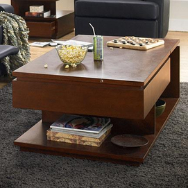 Contemporary style Constructed of solid wood with veneer Overall chesnut finish Flat bottom legs with plastic floor guides 1 divided base shelf for storage or display Easy assembly 48" D x 28" W x 19" H