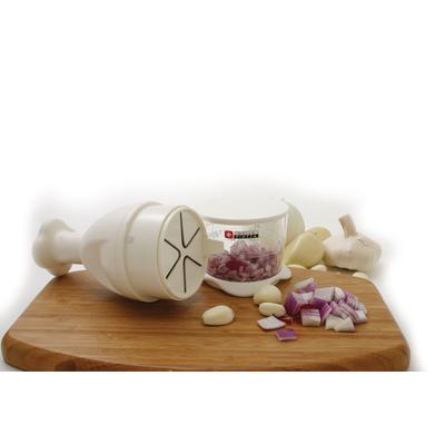 Quickly and easily chops your favourite foods. No more stinging eyes from onions. Made of durable white ABS plastic and stainless steel blades with an integrated chopping pad to avoid mess. Achieve both coarse chops and fine dices. Great fo... Read more