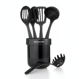 Set includes ceramic crock, ladle, slot spoon, slot turner, baste spoon and pasta server All tools are made of plastic, crock is ceramic