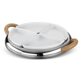 4-segment starter dishes to serve 4 different starters classic white porcelain microwave and dishwasher-safe oven-proof up to 280º C 14 7/32'' w. x 14 7/16'' d. x 17/16'' h. stainless steel serving tray not included