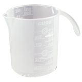 Set of 2 measuring cups. Made of plastic. 3 measuring graduations: ounces, milliliters and cups. Pouring spout and long open handle.