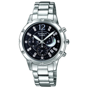 Casio Sheen ladies fashion moon watch, a cool design combines feminine styling and plenty of functionality with the Swarovski elements for hour markers and bezel. Features: Case: Stainless steel Bracelet: Stainless steel Dial: Black Bezel... Read more