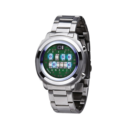 OverviewDetails and SpecsThis stylish, handsome watch features a custom shaped stainless steel case and wristband, hardened mineral crystal lens, and 10 LED lights that display the time using a binary method. More Information The binary forma... Read more