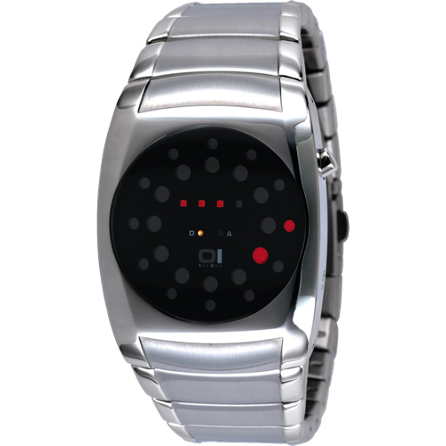 OverviewDetails and SpecsThis watch is a great conversation-starter, due to its stylish design and unique time display system. It features a custom mid-size stainless steel case and band, and hardened mineral crystal lens. It uses LED lights in a... Read more