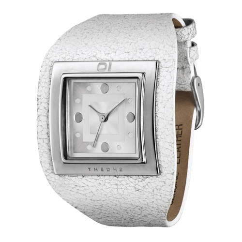 OverviewDetails and SpecsThis watch blends minimalist fashion with easy practicality, featuring an attractive, slim case that's neatly fastened to the top and bottom of a wide leather wristband with fashionable white crackle finish. The square clock... Read more