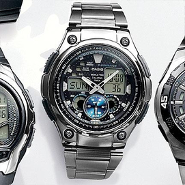 4 daily alarms countdown timer auto calendar ‘Best Lap’ indicator world times for 48 cities LED light with Afterglow black dial stainless steel bracelet water-resistant: 100 metres