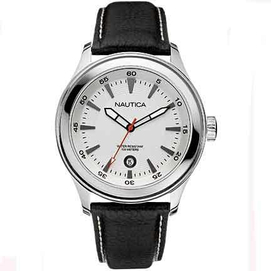 Nautica, a modern American classic, offers quality, design and value while capturing the essence of an active, adventurous and spirited lifestyle. Silver case. Black leather watchstrap with white stitching. Round silver dial with date. Colour... Read more