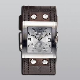 water-resistant to 30 m luminous hands brown genuine leather strap with cuff silvertone dial Japanese quartz movement stainless steel cases 20-year limited warranty; details with purchase