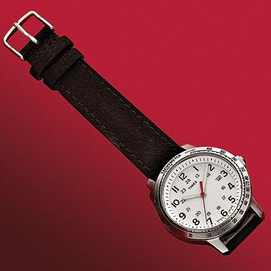 chrome-colour case date feature nubuck leather strap INDIGLO® night light water-resistant to 30 metres warranty details with purchase INDIGLO is a registered Trademark of the Indiglo Corporation in the U.S. and other countries.