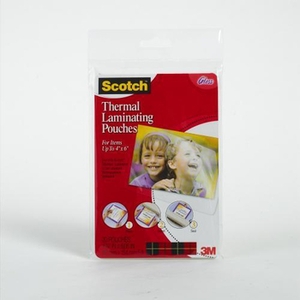 For use with Scotch™ Thermal Laminator or any standard thermal pouch laminator. Provides instant 2-sided protection. 5 mil thick pouches in a glossy finish. Protects frequently handled documents. 4" x 6" size, 20 pouches per package.