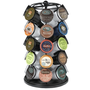 Coffee Pods Coffee at your fingertips Holds 35 K-Cups for the Keurig single serve brewing system (K-Cups not included) Black matte finish with lazy Susan base for easy rotation DIMENSIONS: 13" high x 7" diameter