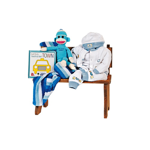 Peter & Paul's Baby Boy Bench Gift Basket (424) - Blue This P&P Wooden Bench is the perfect addition to any little boy's room or in your backyard. This set includes a wooden bench, sock monkey, blanket, book, and four piece outfit. What's in th... Read more