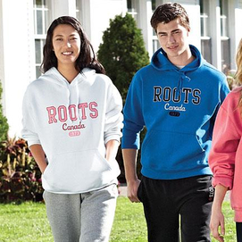 full chest print with flocked Roots logo cotton-polyester machine wash felt flocking for logo Made in Canada using domestic and imported components.