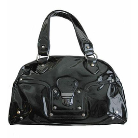 Black patent-look Front buckle detail Top zip closure Inside zipper pocket Interior cell phone pocket Exterior back zip pocket Polyurethane material Cotton Twill lining 24cm H x 38cm W x 12cm Deep 20cm handle drop