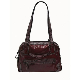 Bright leather-like finish with matching lizard trim. Top zip closure Front slash pocket Front zippered pocket Back zippered pocket Inside zippered pocket Organizer pockets 15'' L x 10'' H x 4.5'' W 12'' drop length Body... Read more