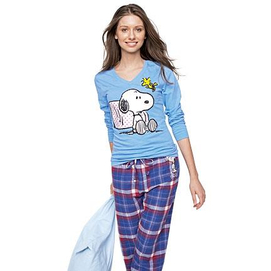powder blue/navy print knit t-shirt, cotton-polyester jersey woven plaid pant, cotton, with drawcord waist machine wash PEANUTS© United Feature Syndicate, Inc.