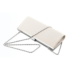 nickeltone frame, clasp and removable chain 23" drop length polyester satin nylon lining one open pocket interior pearl 11" w. x 1 1/2" d. x 4 1/2" h.