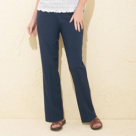 sits at the waist straight leg pressed front crease for a dressier look 2 front pockets gathered back elastic waist polyester-spandex machine wash 30" inseam while quantities last