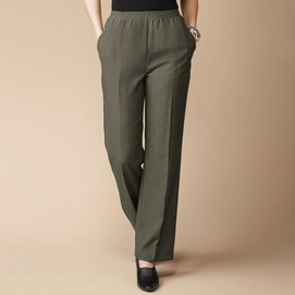 sits at waist straight leg all-around elasticized waist 2 front pockets 30" inseam, 28" in petite sizes polyester with a textured stripe machine wash