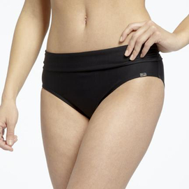fold-over waistband with side shirring leg style #2 hip minimizer fit nylon-spandex polyester- spandex lining hand wash black
