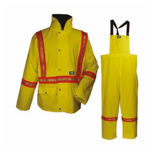Safety Rainsuit PVC coated nylon Taped seams Removable drawcord hood serves as a carrying case for jacket and bib pant Safety striping on sleeves, around torso, down front, "X" on back and lower legs JACKET: Zipper front closing with externa... Read more