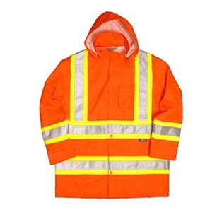 Rainwear/Umbrellas Hi Visibility Rain Suit Jacket Fluorescent orange 100%PU coated poly oxford/ripstop Quick release hood Dual back vents Chest pocket with flap & 2 lower pockets Double fly front with snaps Dual waist stripes Mesh line... Read more