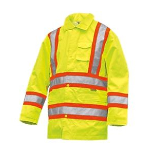Rainwear/Umbrellas Hi Visibility Rain Suit Jacket Fluorescent yellow 100%PU coated poly oxford/ripstop Quick release hood Dual back vents Chest pocket with flap & 2 lower pockets Double fly front with snaps Dual waist stripes Mesh line... Read more