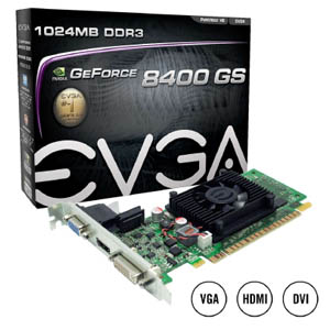 EVGA GeForce 8400GS 1GB (01G-P3-1302-LR) nVidia GeForce 8400GS Chipset (520Mhz) 1GB (520Mhz) DDR3 Dual Display DVI/HDMI/VGA PCI Express 2.0 Graphics Card