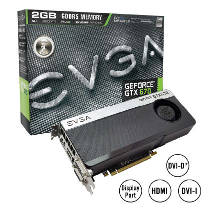EVGA GeForce GTX 670 Superclocked 2048MB GDDR5 (02G-P4-2672-KR) nVidia GeForce GTX 670 Chipset (1046Mhz) 2048MB GDDR5 (6210Mhz) Dual Display 2x DVI-I/HDMI/Display Port PCI Express 3.0 Graphics Card