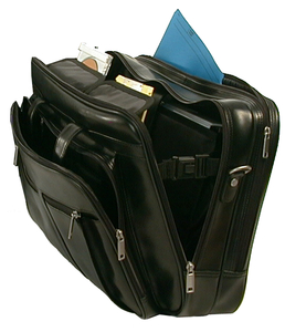 Executive leather briefcase. First main compartment holds up to a 15.6" laptop (15.25" 11 3/4"), second file folder section, plus additional gusset in front with organizer section for all business essentials.