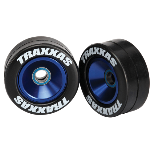 Traxxas 5186A Aluminium Wheels (1-Pair) - Blue Customize the look of your Traxxas truck with these vivid blue-anodized Traxxas Wheelie-bar Wheels. These rubber tires fit 1/10 scale vehicles and feature the Traxxas logo.