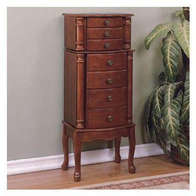 Classically shaped freestanding jewelry armoire features cherry veneer with a Classic Cherry finish. There are 3 small curved drawers, 2 large curved drawers, and 1 curved door cabinet that are perfect for storing a variety of jewelry an... Read more