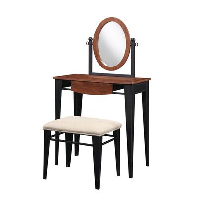 Contemporary vanity with adjustable mirror and bench set is an attractive addition to any room. Vanity has a center drawer perfect for cosmetics. Finished in faux Mahogany with Marquetry wood and Matte Black metal. Bench seat is covered in Beig... Read more